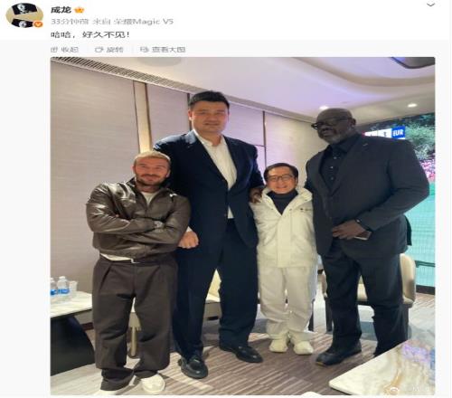 在首场比赛结束后,贝克汉姆在社交平台上晒出与姚明、成龙和奥尼尔的合影,并写道:“见到了三位传奇,很棒的比赛。”成龙则发文称“好久不见”。