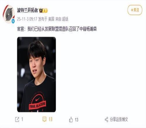 11月3日,据向阳视频,@波兰特开拓者 官宣:我们已经从发展联盟混音队召回了中锋杨瀚森。