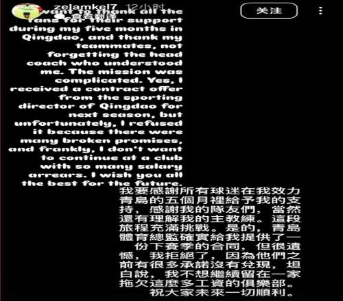 兰克尔-泽写道:“我要感谢所有球迷在我效力青岛的五个月里给予我的支持,感谢我的队友们,当然还有理解我的主教练。这段旅程充满挑战。”