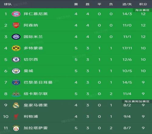 欧冠第5轮率先结束了9场比赛,最新积分榜如下!