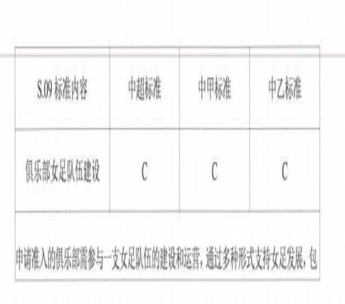 另外,涉及到俱乐部女足队伍建设,中超标准为“A”、中甲和中乙标准为“C”。