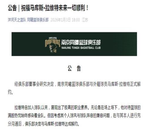 经俱乐部董事会研究决定,南京同曦篮球俱乐部与外籍球员马库斯·拉维特正式解约。
